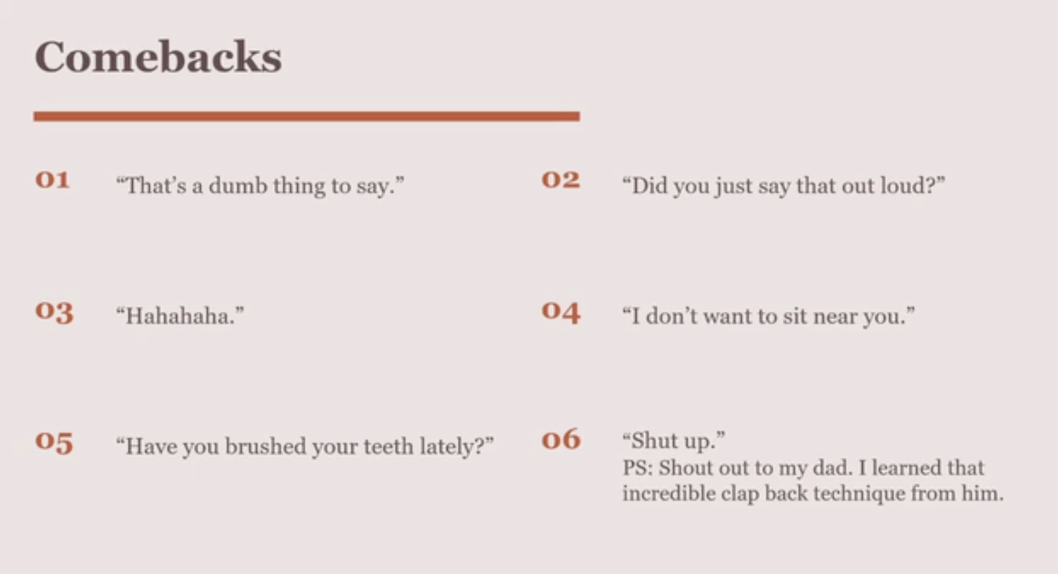For inspiration, I’ve enclosed a couple of slides from Ann’s talk on “Diminishing Statements” and “Comebacks” below.